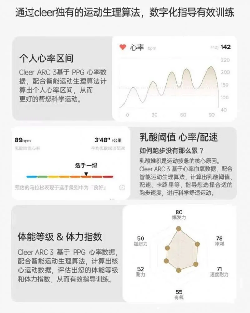 Cleer與GoMore還共同為ARC 3 音弧 運(yùn)動(dòng)版Pro搭載了如個(gè)性化心率區(qū)間、有氧關(guān)鍵指標(biāo)、能量消耗、訓(xùn)練分析、實(shí)時(shí)狀態(tài)、進(jìn)階跑步指標(biāo)在內(nèi)的一系列運(yùn)動(dòng)生理算法。在Cleer+app后臺(tái)能根據(jù)心率和血氧數(shù)據(jù)的變化,為用戶提供精準(zhǔn)體能評(píng)估、訓(xùn)練效果分析及體力估算等功能體驗(yàn),這些指標(biāo)功能不僅有助于準(zhǔn)確評(píng)估跑步能力,還能實(shí)時(shí)監(jiān)測(cè)訓(xùn)練成效,為用戶制定更加科學(xué)合理的訓(xùn)練計(jì)劃提供有力支持。