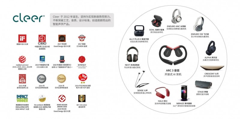 到今年最新推出的 ARC 5 音弧,則將開放式耳機的音質天花板推向新維度。它首次集成THX空間音效、DTS 空間音效與杜比音效帶頭部跟蹤三大全球頂尖音頻技術,成為全球首款同時獲得 THX 認證與DTS加持的開放式耳機。通過THX 認證的影院級聲場,確保聲音的精準還原與動態(tài)平衡;DTS空間音效則以卓越的多聲道環(huán)繞音效著稱,讓開放式耳機也能展現(xiàn)出多維度的寬廣聲場;杜比音效帶頭部跟蹤技術,讓聲音可實時跟隨頭部運動調(diào)整方位,仿佛置身于音樂現(xiàn)場。無論是低頻的震撼沖擊力還是高頻的細膩解析力,ARC 5都能以精準、動態(tài)和立體的方式完美呈現(xiàn)。在AI性能方面,ARC 5也邁出了跨越性的一步,搭載Cleer自研AI智能體“聽道”,能夠游刃有余地執(zhí)行AI語音筆記實時轉寫、AI同聲傳譯等任務,從聽音設備脫胎換骨,成為一款多功能的AI新質生產(chǎn)力工具。Cleer正在用一次次技術迭代證明:開放式耳機不僅能打破傳統(tǒng)耳機的物理桎梏,更能以革命性音質與功能重塑聽覺體驗。憑借在聲學技術和功能設計等的多維突破,ARC 5在正式上市前就已贏得業(yè)界高度認可,摘得2025日內(nèi)瓦發(fā)明獎銅獎、2025德國紅點設計獎等殊榮,并在近期BEYOND Expo 2025上榮膺展會最高榮譽“BEYOND BEST CHOICE Awards”,充分展現(xiàn)了其頂尖實力與市場潛力。